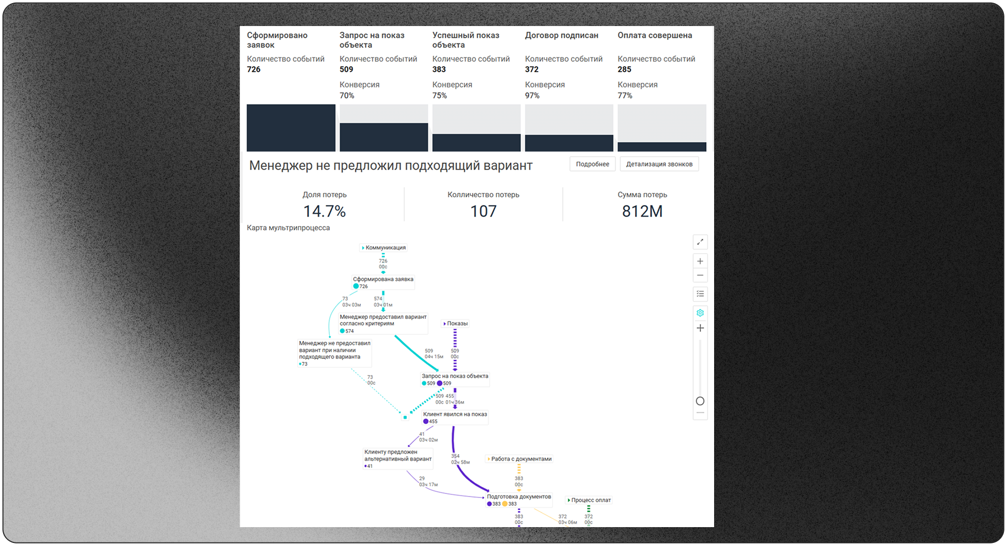 В Proceset данные для анализа собираются и обновляются автоматически в режиме онлайн, чтобы бизнес-пользователи могли видеть актуальную информацию, быстро реагировать на отклонения и предотвращать риски срыва сделок.