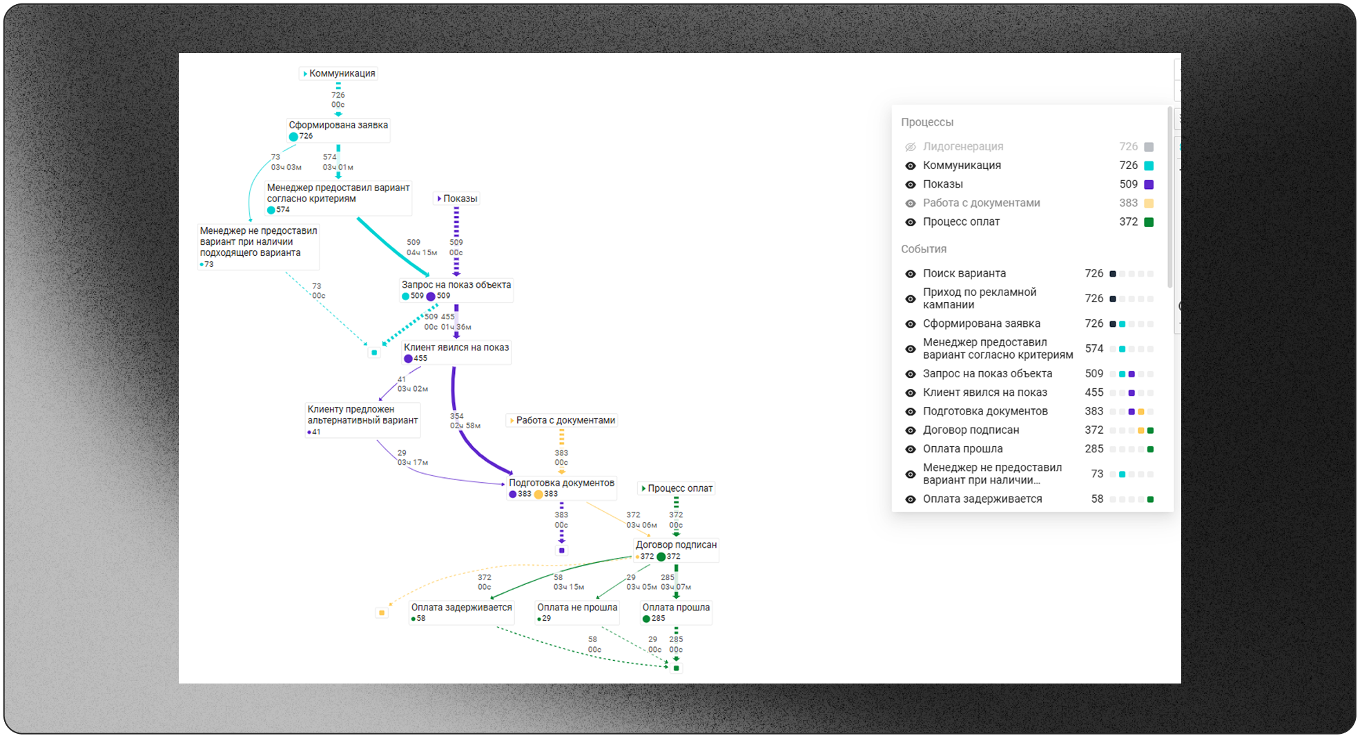 Анализ в Proceset позволяет находить ошибки и отклонения в реальном времени и предотвращать риски в момент их возникновения.